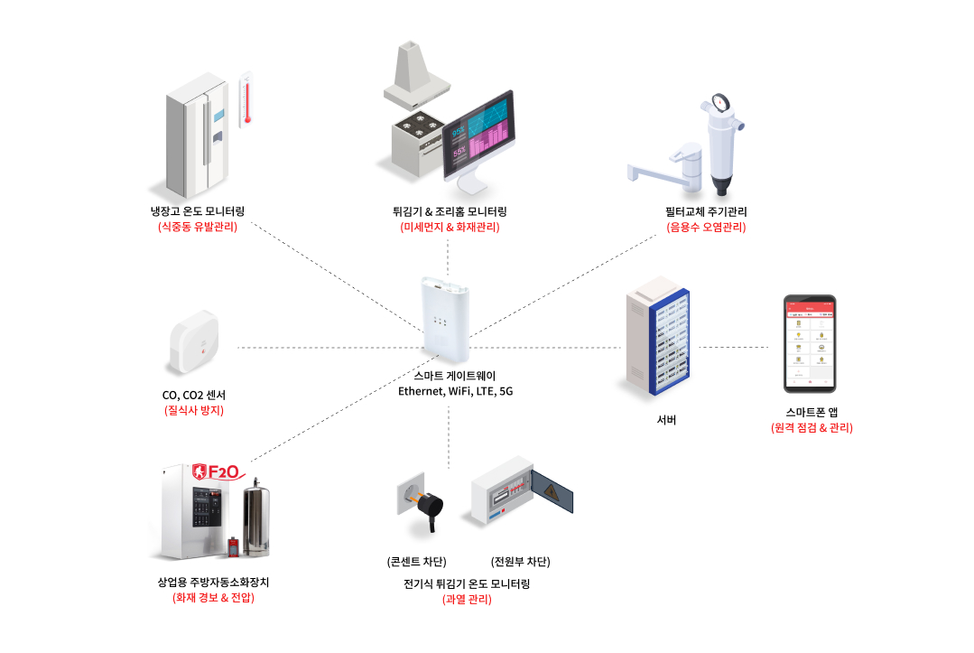 F2O 제품과 IoT 센서를 Gateway에 연동하여 조리실 흄과 식품의 안전을 관리